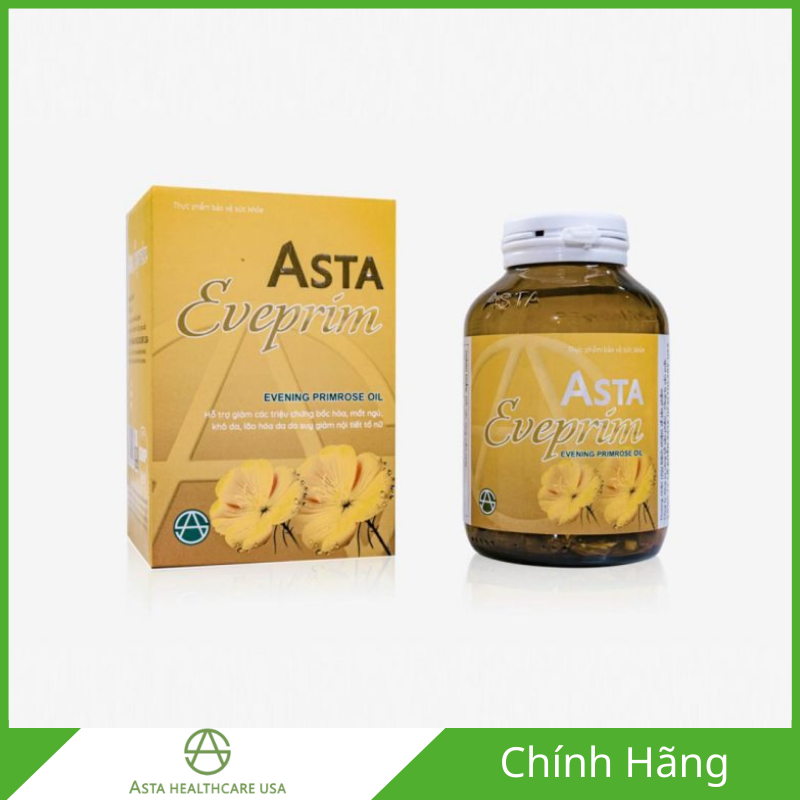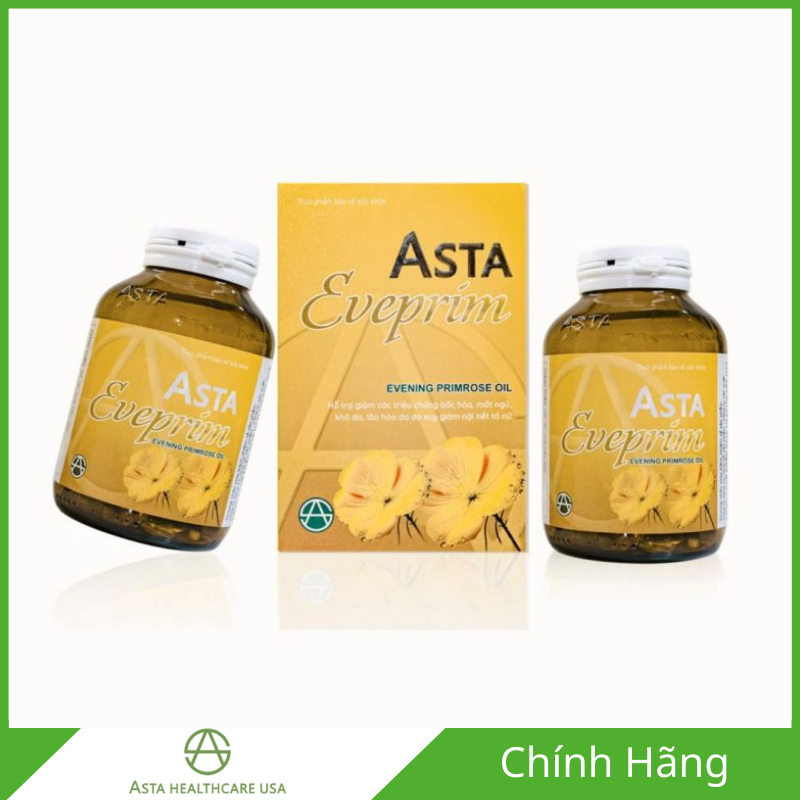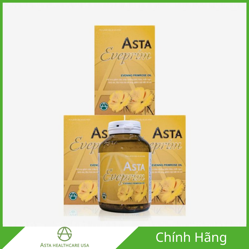Asta Eveprim là thực phẩm bảo vệ sức khỏe do ASTA Healthcare USA nghiên cứu và phát triển, với thành phần chính là dầu hoa Anh Thảo (Evening Primrose Oil) cung cấp Gamma Linolenic Acid (GLA) kết hợp cùng Vitamin E. Sản phẩm hỗ trợ giảm các triệu chứng thường gặp do suy giảm nội tiết tố nữ như bốc hỏa, mất ngủ, khô da và lão hóa da, đặc biệt ở phụ nữ giai đoạn tiền mãn kinh và mãn kinh. Asta Eveprim được bào chế dưới dạng viên nang mềm, dễ hấp thu, phù hợp cho phụ nữ trưởng thành có nhu cầu chăm sóc sức khỏe nội tiết và duy trì làn da tươi trẻ theo hướng an toàn, lâu dài.