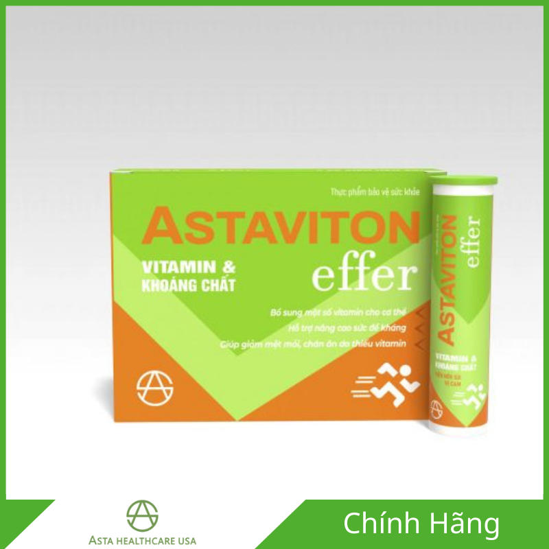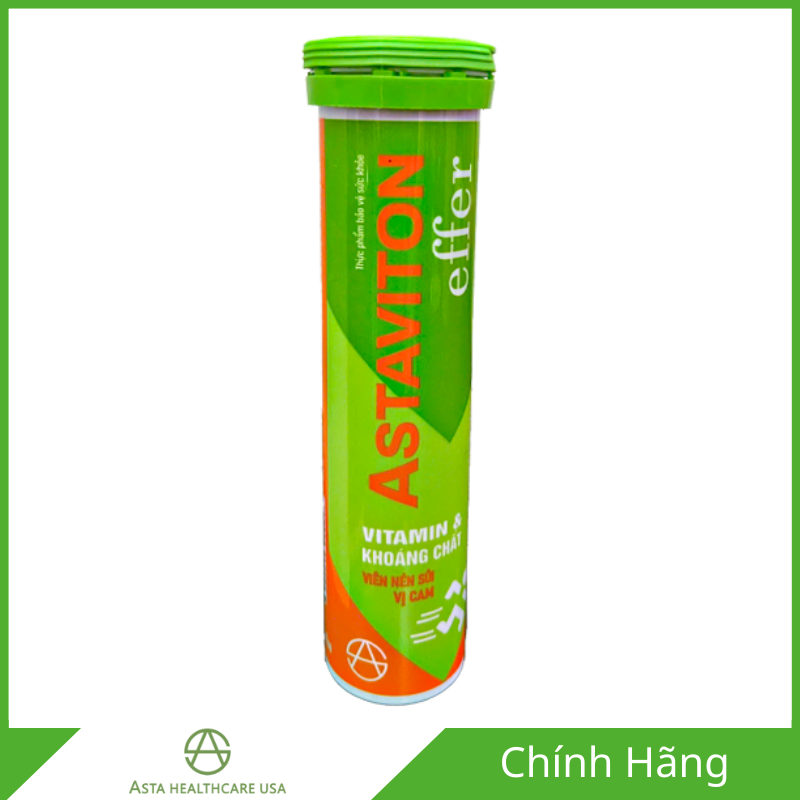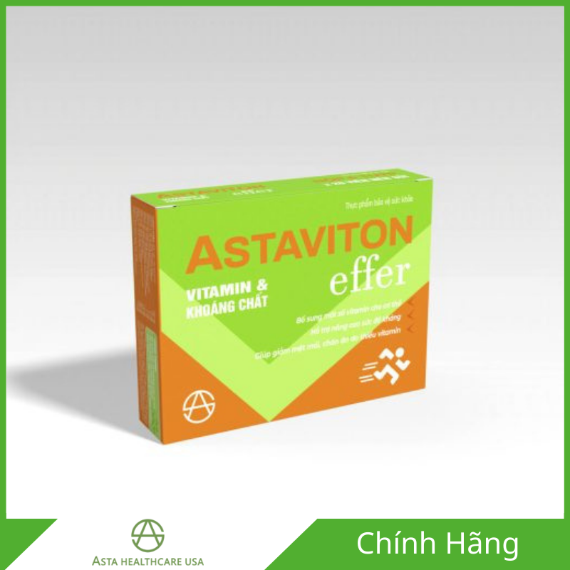 Astaviton Effer là thực phẩm bảo vệ sức khỏe do ASTA Healthcare USA nghiên cứu và phát triển, được bào chế dưới dạng viên sủi hương cam, dễ hòa tan và hấp thu nhanh. Sản phẩm cung cấp đa dạng vitamin và khoáng chất thiết yếu như Vitamin C, Vitamin E, vitamin nhóm B, kẽm, đồng và D-Biotin, giúp hỗ trợ nâng cao sức đề kháng, giảm mệt mỏi và chán ăn do thiếu vitamin. Astaviton Effer phù hợp cho người trưởng thành và trẻ em từ 12 tuổi cần bổ sung vi chất trong giai đoạn cơ thể tăng nhu cầu vitamin và khoáng chất.